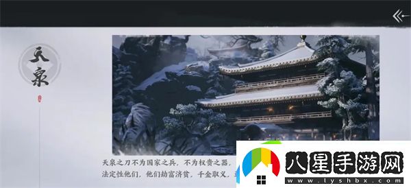 天泉門(mén)的宗旨是正義與公義,主攻刀法,堅守行俠仗義的信條,適合那些熱愛(ài)正義的玩家。